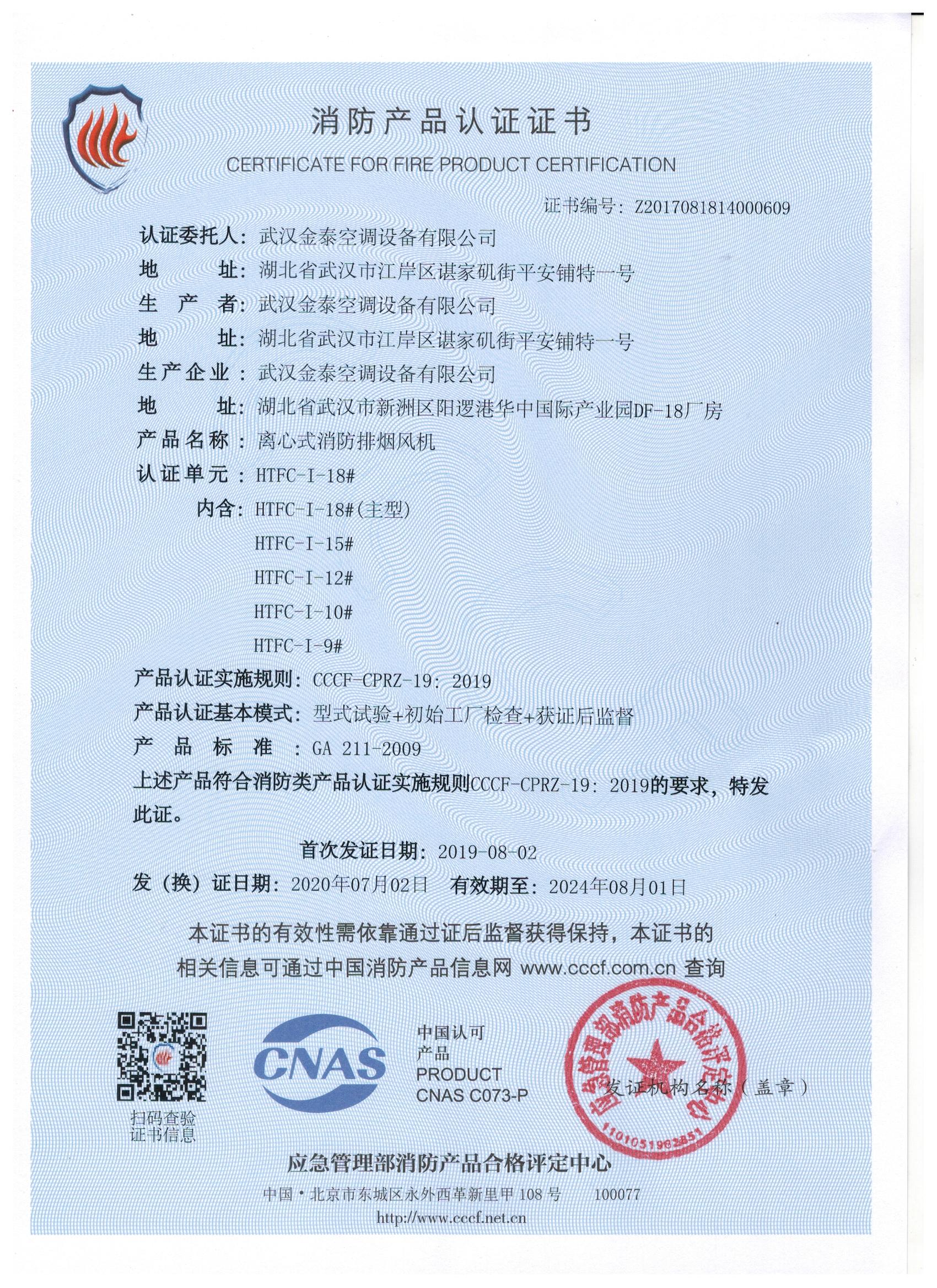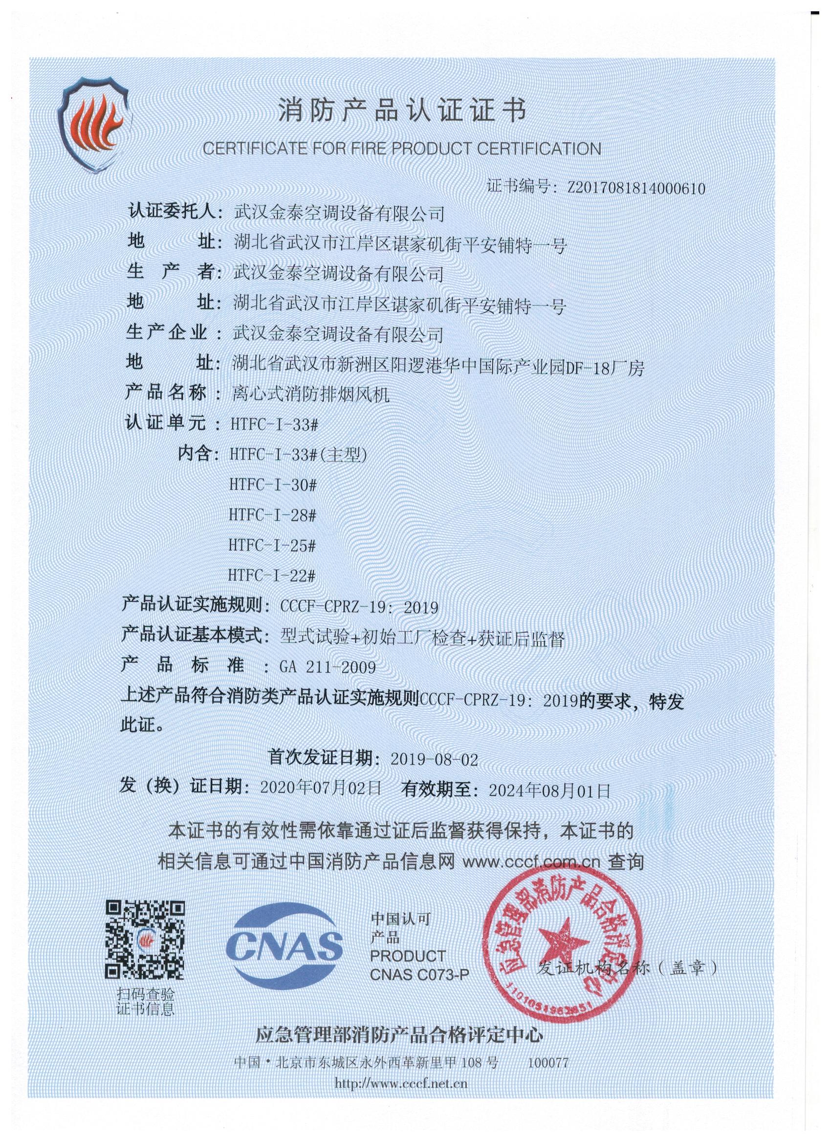 武漢金泰空調(diào)設(shè)備有限公司 是國內(nèi)長期專注于民用風(fēng)機、工業(yè)風(fēng)機領(lǐng)域的標(biāo)桿企業(yè):專業(yè)生產(chǎn)消防排煙風(fēng)機系列、排煙防火閥系列、一般通風(fēng)機系列(軸流式、離心式、屋頂式、壁式、隧道式、射流式)、風(fēng)口、風(fēng)管等消防及通風(fēng)設(shè)備。產(chǎn)品經(jīng)公安部消防產(chǎn)品合格評定中心評定符合消防產(chǎn)品CCC標(biāo)準;經(jīng)中國合格評定國家認可委員會認證的檢驗所檢驗合格;經(jīng)國家防火建材質(zhì)量監(jiān)督檢驗中心(四川中心)火燒實驗,耐火性能達標(biāo)。